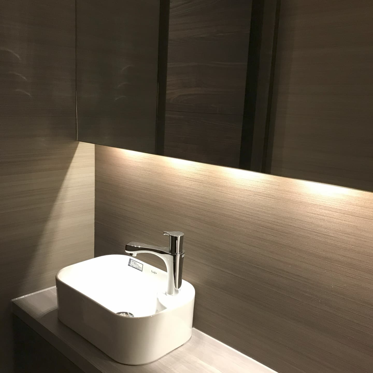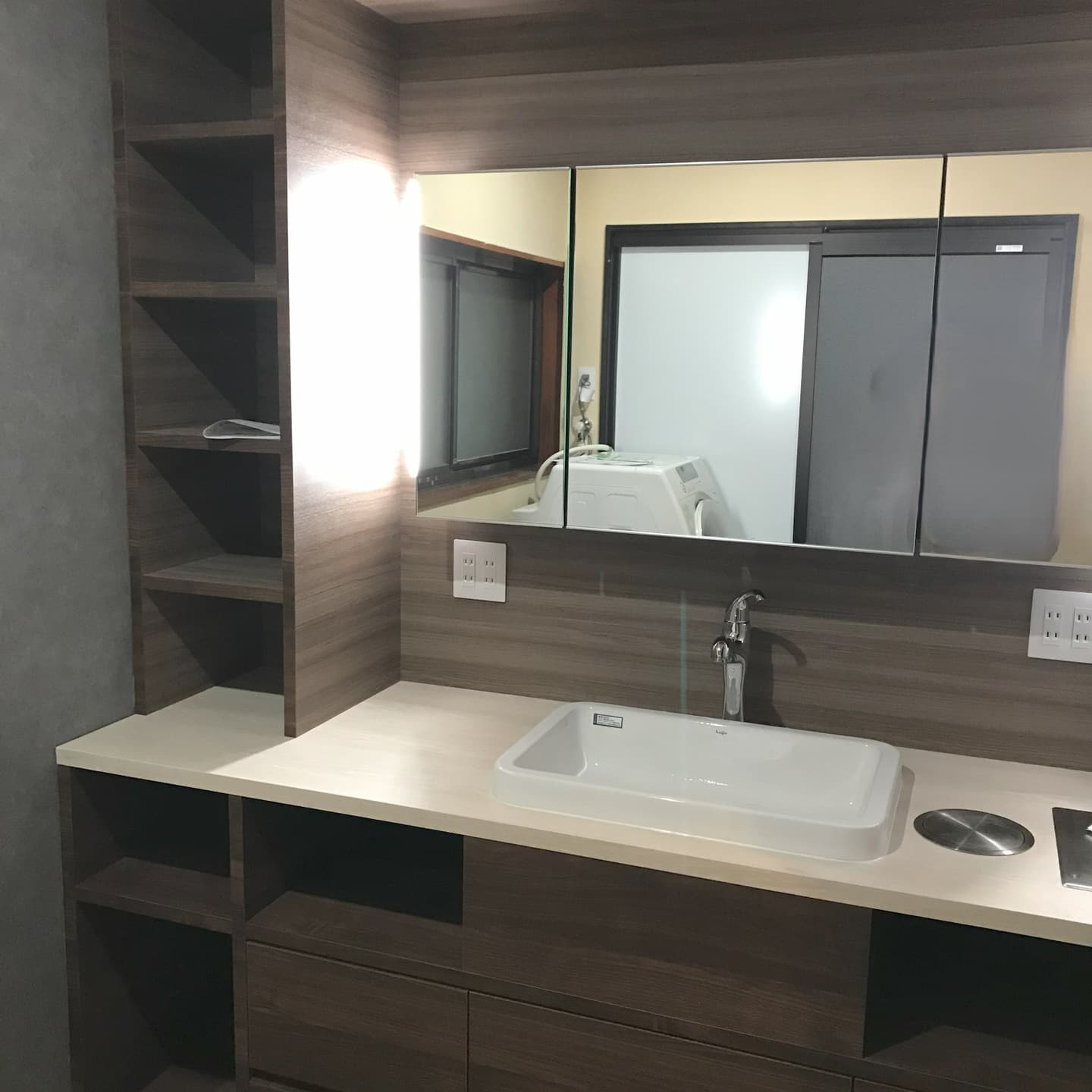 ドラム洗濯機の扉が全開できない狭い洗面&脱衣スペースは、既存のトイレの壁をぶち破り広くしました。洗面台は収納を増やしたオリジナルで製作。トイレは間接照明を多く取り入れ高級感のあるデザインにしました。トイレ棚も洗面台に殻を合わせ、扉も同じ柄にして統一感のあるリフォームとなりました。